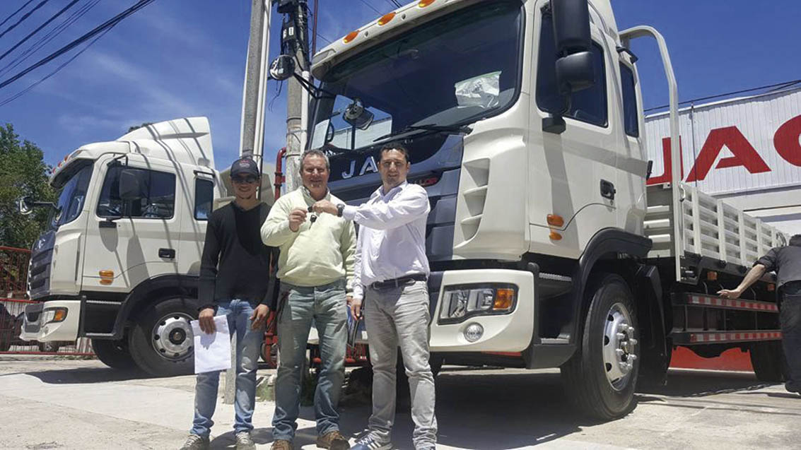 JAC MOTORS Latinoamerica (EXISTIR S.A) Uruguay entregó el 3er. camión JAC 160 GALLOP 4x2 a Transplant Srl. de Paysandú. Entrega las llaves Gerardo Echave (Gerente de administración) junto a Ricardo Zabaleta (Propietario) y José Monzón (Mecánico).
