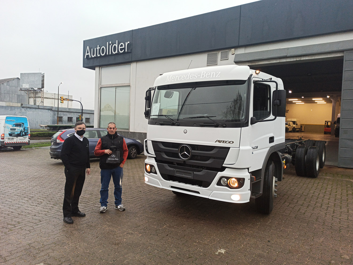 Entrega de un camión Atego 2428 a la empresa Ramón Ferrero Srl. de Paysandú. Al momento de recibir la unidad, Milton Fernández recibe las llaves de manos de Alejandro Borche. La venta la hizo Oscar Guichón de Paysandú.