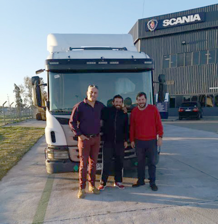 Primera unidad de la empresa Powell Transportes SRL, comercializada por José María Durán S.A. Los vendedores Rubén De Los Santos y Agustín Sardina al momento de la entrega de la unidad.