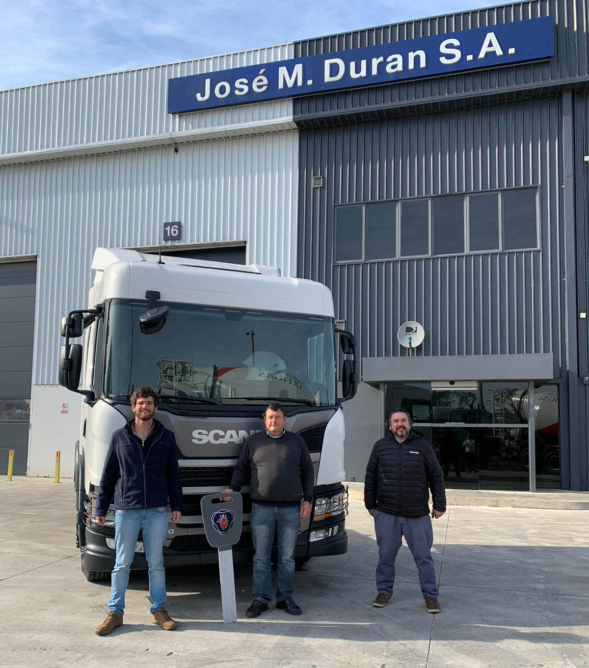 La empresa TTC Ltda. es adquirió en José María Duran S.A. un Scania P450 6 x 2. En la imagen, José Pérez, Santiago Pérez y Marcelo Lagreca de José María Duran S.A.