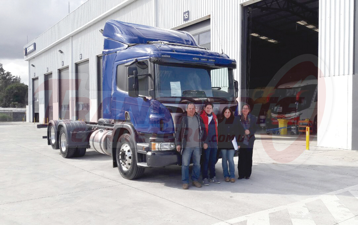 José M. Durán S.A. le vendió a la firma Washington Revetria su 6ta. unidad Scania, en esta oportunidad una P410 B6x2. En la imagen (de izq. a der.): Fernando, Nicolás y Yuliana Revetria, y Lucía Fabra, Logística de ventas y Análisis Comercial de Scania.