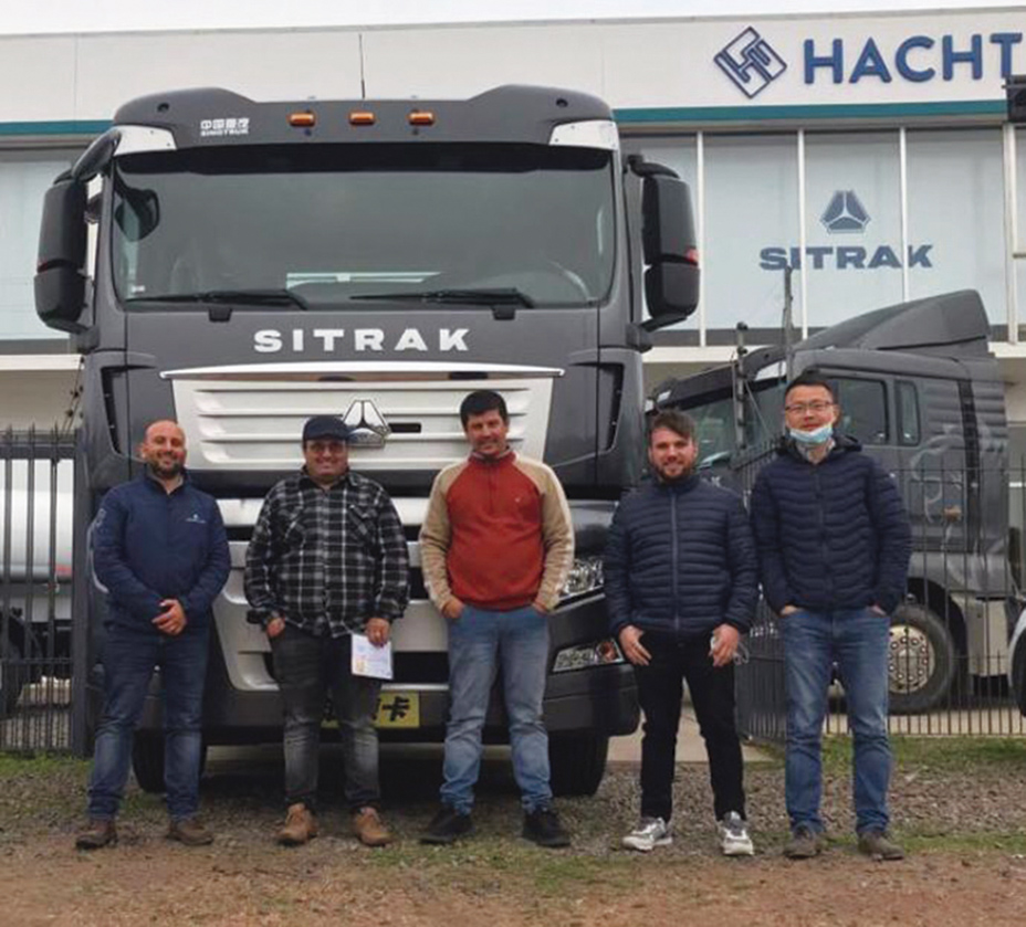 La constructora Gofinal de Paysandú incorporó a su flota en un Sitrak C7H 430 HP 6x2 tractor. En la foto Nicolás Peña (Hacht), Ruben Martínez, Fernando Rodríguez, Luciano Eramuspe por Gofinal y Lou Wei por Sinotruk International.