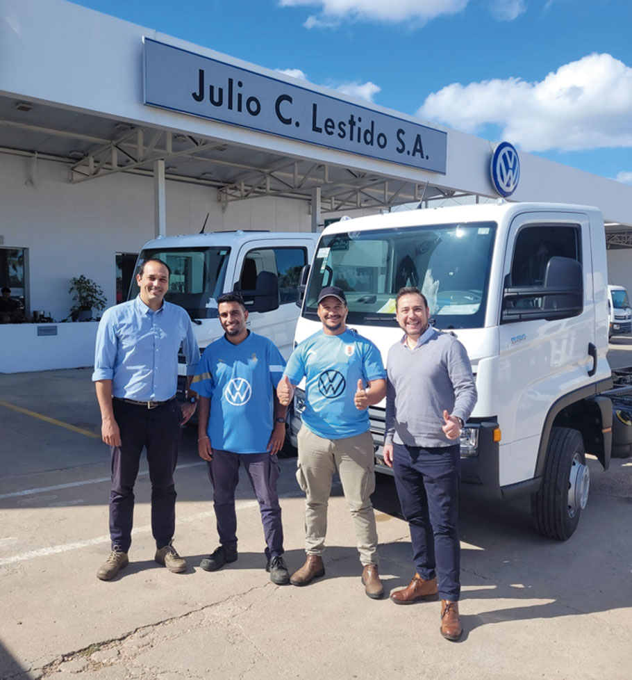 Ártico adquiere 3 Volkswagen Delivery 9.170. Entregan por Julio C. Lestido S.A., Paul Gallo y Javier Abila, a Claudio López y David Calderón de la empresa compradora (con remera de Uruguay).