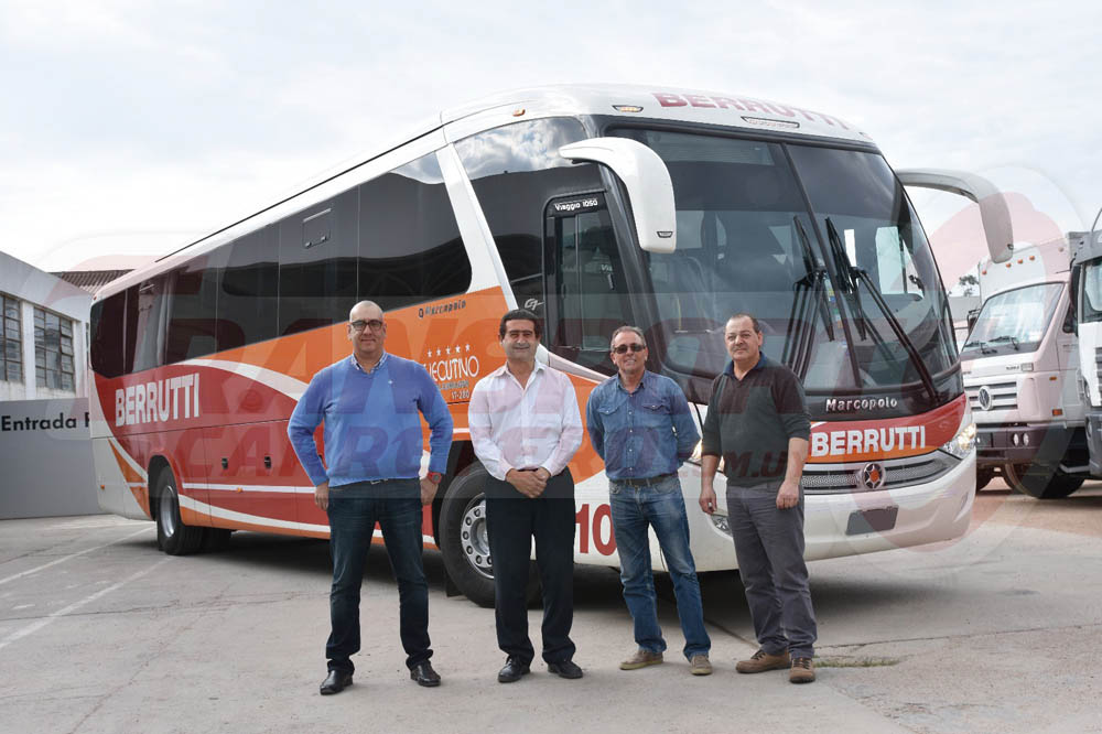Julio C. Lestido S.A. entregó a Berrutti Turismo entregó una unidad con chasis VW 17280 OT con caja automática ZF Ecolife. En la fotografía: recibió la unidad Mario Vivanco, de manos de Miguel Remeseiro, Carlos Fraga y Antonio Reyes de Julio Cesar Lestido S.A.