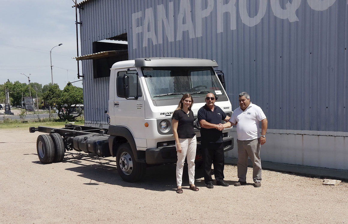 Fanaproqui S.A., representada por los gerentes Valentina Pradines y Hugo Suárez, recibe su camión VW 10.160 Delivery de manos del señor Juan C. Sosa de la empresa Werner Bernheim.
