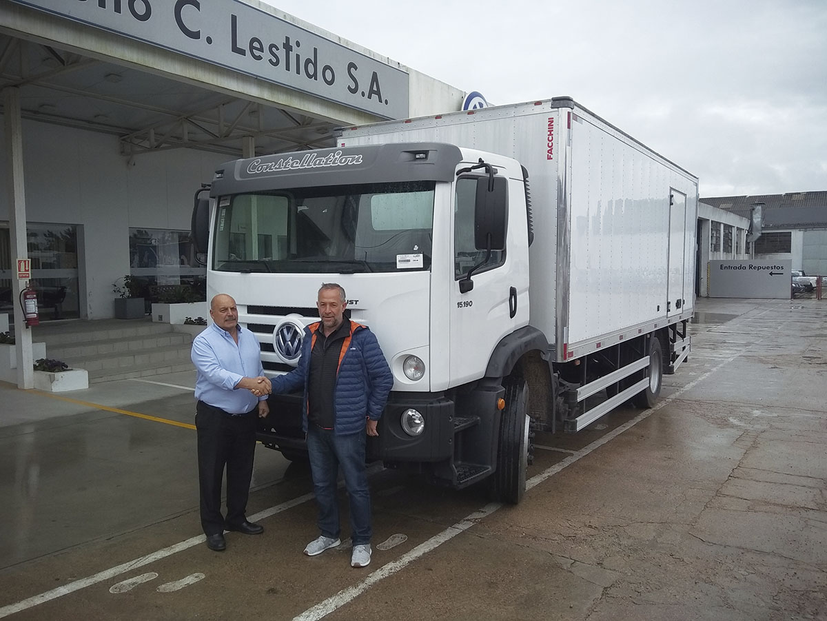 El señor Robert Álvarez recibe su tercer camión VW de manos de Juan C. Sosa de Werner Bernheim. En esta oportunidad se trató de un VW 15.190 con furgón Fachinni.