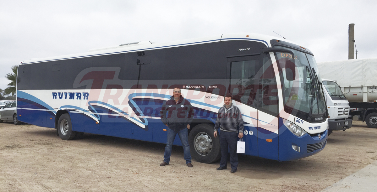 Julio C. Lestido comercializó un chasis VW 17-230 OD a la transportista RUIMAR; la misma está encarrozada con un Marcopolo modelo Ideale. Entregó la unidad Carlos Fraga (izq), Asesor Comercial - División Camiones y Buses, a Matías Ruiz de Ruimar.