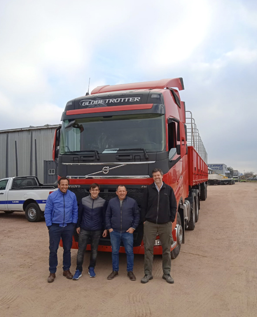 Se entregó un nuevo Volvo FH 460 tractor enganchado con un semirremolque Randon a la firma Mario Corujo. En la foto se encuentran: Darío Rodríguez, Juan Manuel Corujo, Mario Corujo, y Alejo Maisonnave de Mekatronic.