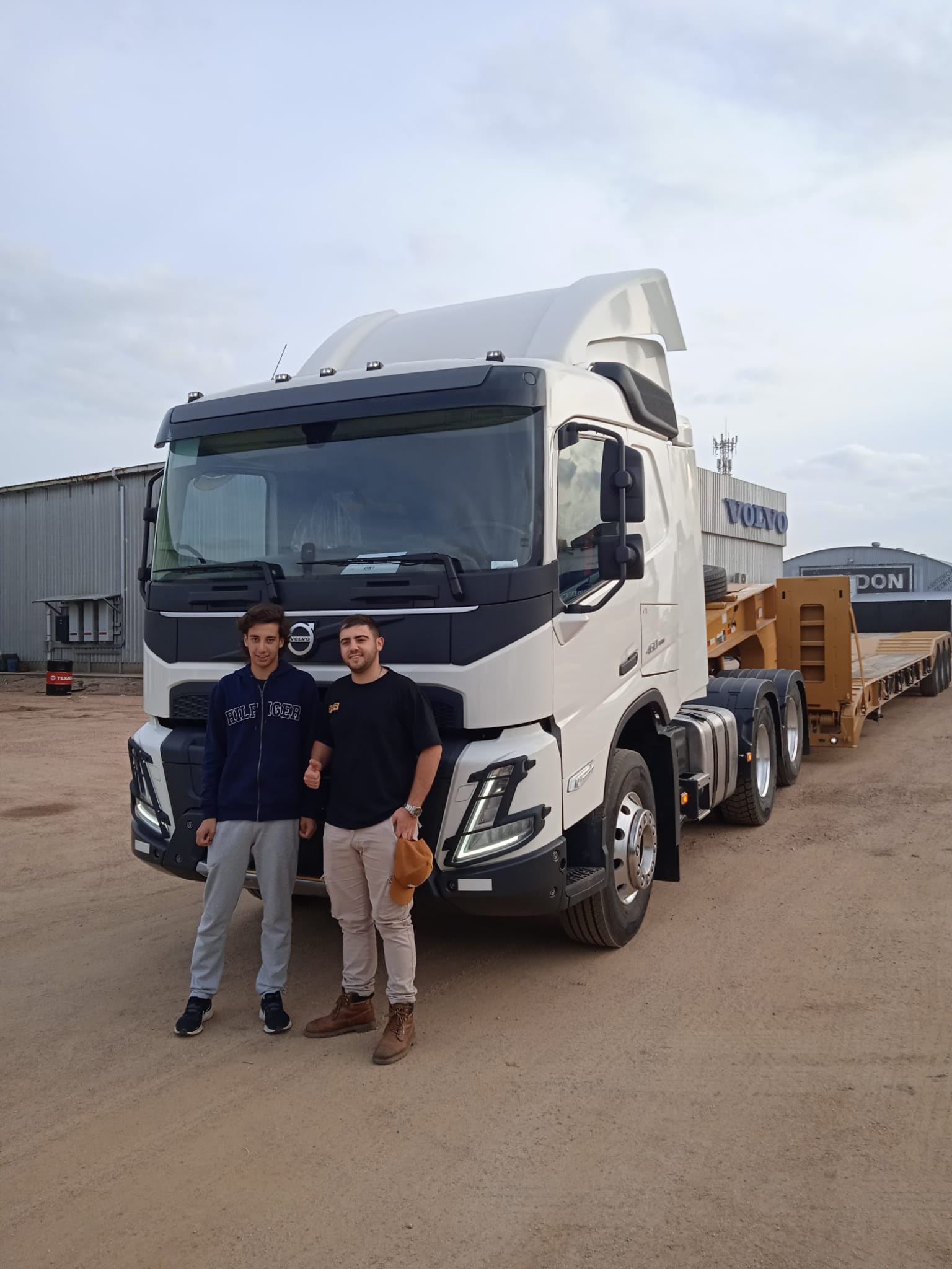 Entrega de Volvo FMX 460 6x2T y semirremolque porta máquina Randon. Empresa TUGUANEIT SAS. En la foto: Bruno y Matías Cedrés.