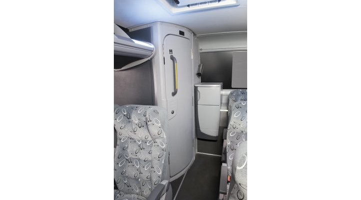 TECHO INTERNO: El techo interno del salón está formado por el módulo de techo principal, de P.U. (Poliuretano) y fibra, revestido por película de PVC, un material más leve y que absorbe los ruidos. La curva en woodstock revestido de moqueta, es ideal para no causar daños a los equipajes de mano.