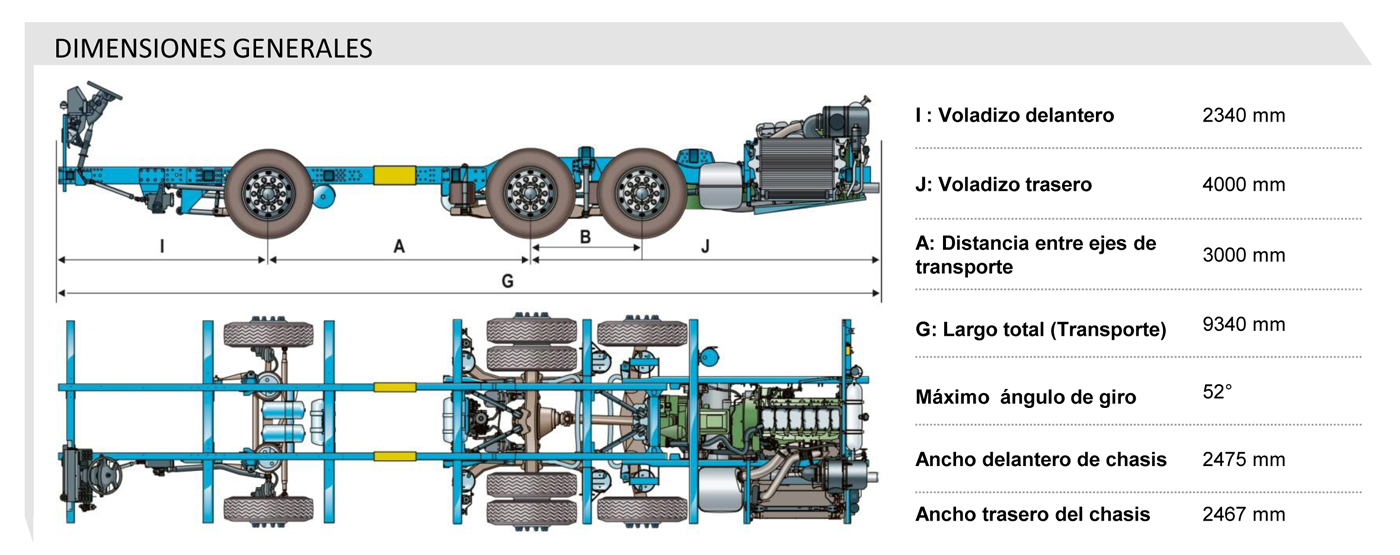 * Suspensión: Suspensión delantera : Neumática con capacidad máxima de eje de 7.500 Kg, barra estabilizadora. Suspensión trasera: Neumática con capacidad máxima en el eje de ( 17.500Kg ), barra estabilizadora. Control electrónico ELC. Elevación y descenso total 100mm.
